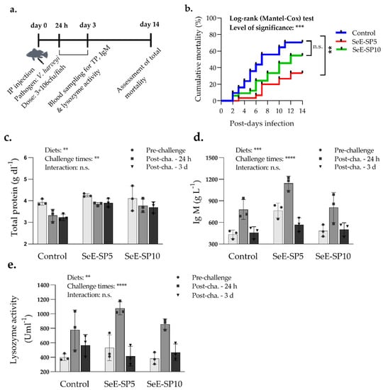 Serum immunological response and mortalities of seabass juveniles challenged with the Vibrio harvei after 56 days of the feeding trial (a) Timeline of blood collection and mortality assessment followed by V. harveyi infection; (b) Survival curve of juvenile seabass after challenge with V. harveyi for a period of two weeks (Kaplan–Meier survival method, followed by Log-rank test, p < 0.05); (c) total protein; (d) immunoglobulin M (IgM); and (e) lysozyme activity of fish at pre-challenge and post-challenge of fish at 24 h and 3 day. Bars holding various asterisks (** ), (***) and (****) indicates whether any significant variation amongst diets, time of sampling and interaction between diets and sampling times (two-way ANOVA; Tukey post-hoc test) at p < 0.05, p < 0.01 and p < 0.001 respectively. n.s., indicates non-significant differences at p < 0.05.