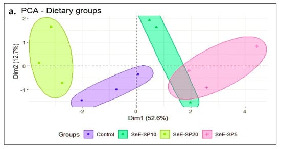 The PCA analysis was applied to investigate the effect of SeE-SP diets on various growth, immunity, and health parameters in fish. The position of the dietary groups and variables in the plot showed that the SeE-SP5 and SeE-SP10 diets had a favorable influence on fish growth and wellbeing, whereas the SeE-SP20 diet had a negative association with fish performance. The PCA analysis was applied to investigate the effect of the SeE-SP dietary groups on various growth, immunity, and health parameters in fish. Previously, the PCA was also used to assess the data from the whole range of digestive enzyme activity in various species of annelida, in order to determine their dietary preferences [69]. In the present experiment, the position of the dietary groups and growth, immunity, and health parameters in the plot showed that the SeE-SP5 and SeE-SP10 diets had a favorable influence on fish growth and overlapped each other, whereas the SeE-SP20 diet had a negative association with fish performance. Indeed, the SeE-SP5 and SeE-SP10 diets significantly influenced IFh and IGCn, indicating that these diets enhanced intestinal health. The PCA revealed that the fish meal replacement with soy protein concentrate at a level of 50% did not affect the growth of the juvenile lumpfish (Cyclopterus lumpus) and up to 70% did not affect the IFH and IGCn [70]. However, in our study, the SeE-SP supplementation at rates of SeE-SP5 and SeE-SP10 was observed to positively connect to IFH and IGCn, while the control and SeE-SP20 negatively impacted these variables.