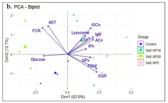 The principal component analysis (PCA) was performed to investigate the effects of the dietary groups on various growth, immunity, and health parameters in fish. The first two principal component axes (PC1 and PC2) explained more than 65.3% of the variation in the data, providing information about the predominant correlations between these data. The fish fed the control and the SeE-SP20 diets were grouped together in the PCA biplot’s negative site, where the FCR was negatively correlated with AST, and glucose (Figure 5a). On the other hand, the SeE-SP5 and SeE-SP10 diets grouped together in the PC1 positive zone, where FBW and SGR were found to be highly positively correlated with IFh, IGCn, ACn, TP, IgM, GPx, and lysozyme activity (Figure 5b). This arrangement of the variables demonstrates that the first principal component, which accounts for 52.6% of the variation in all of the parameters, reflects a composite perspective of the majority of the parameters. Additionally, the first principal component (PC1) predicts 52.6% variance, second principal component (PC2) 12.7%, and the third principal component (PC2) 10.52%, and so on. The bi-plot showed that the SeE-SP5 and SeE-SP10 diets were intermingled and overlapped with positive correlation, while the control and SeE-SP20 diets formed distinct groups that were negatively associated with each other.