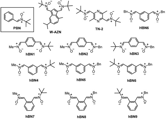 In this context, we have been attracted by the properties and therapeutic possibilities of bis-nitrones such as azulenyl nitrone W-AZN (Figure 1) [15,16] and bis-nitrone TN-2 (Figure 1), [17] and as consequence, we have recently reported a series of homobisnitrones (HBNs) related to PBN, from which HBN6 (Figure 1) exhibited good antioxidant properties [18].