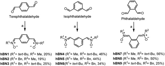 hBNs 1–9 have been prepared to start from commercially available terephthalaldehyde, isophthalaldehyde, and phthaladehyde in a “two-steps-one-pot-reaction”, under the same mild reaction conditions, by subsequent addition of the appropriate and selected N-alkylhydroxylamines, as shown in Scheme 1. The target bis-nitrones have been obtained as a pure compound showing correct IR, NMR and high-resolution mass spectra, as expected from their structures [18] (see Experimental Part and Supplementary Material).
