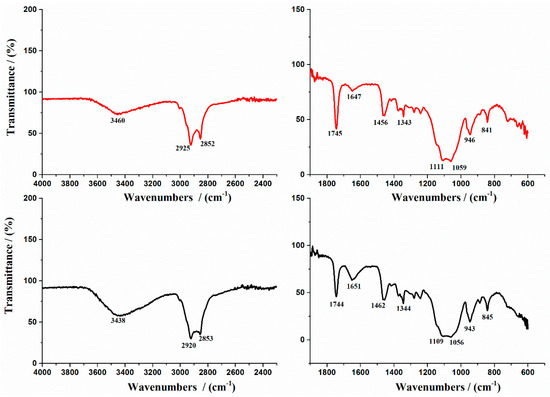 The infrared spectra of the materials (obtained as bioadhesive films) were registered using FTIR equipment (Nicolet Spectrometer 6700 FTIR from Thermo Electron Corporation, Waltham, MA, USA) assisted with a diamond-crystal ATR accessory. In transmittance mode, data were acquired in the spectral range of 400–4000 cm−1 (resolution of 4 cm−1 and a total of 32 scans per spectrum).