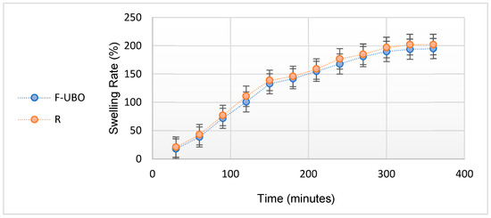 Six films of each formulation (F-UBO and R) were placed on 1.5% agar gel in Petri plates and incubated at 37 ± 1 °C. Every 30 min, for 6 h, the patches were weighed. The swelling rate was calculated according to Equation (3):