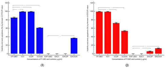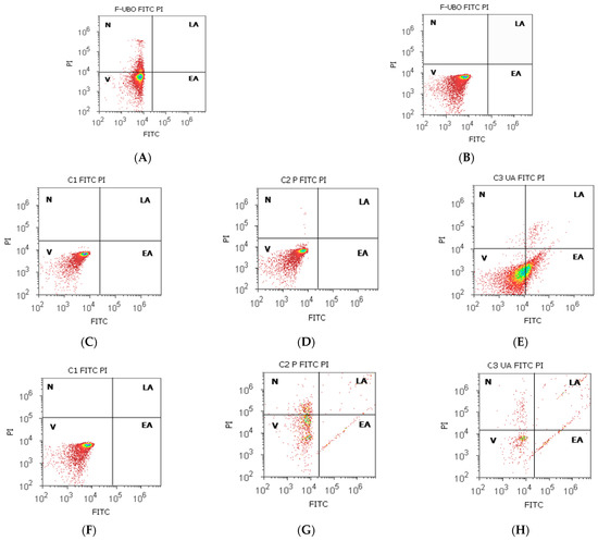 The cells with annexin V-FITC and PI (20 µg/mL) were incubated in darkness, for 30 min, at room temperature [53]. Then, the viable, early apoptotic, late apoptotic, and necrotic cells were examined at a flow cytometer using a 488 nm excitation, green emission for annexin V-FITC (BL1 channel), and orange emission for PI (BL2 channel).