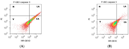 The cells were well-mixed with Magic Red® Caspase-3/7 substrate solution and PI and incubated [53]. Then, the early stages of cell apoptosis by activating caspases-3/7 (DEVD-ases [55]) were analyzed through flow cytometry using a 488 nm excitation, red emission for MR-(DEVD)2 (BL3 channel), and orange emission for PI (BL2 channel).