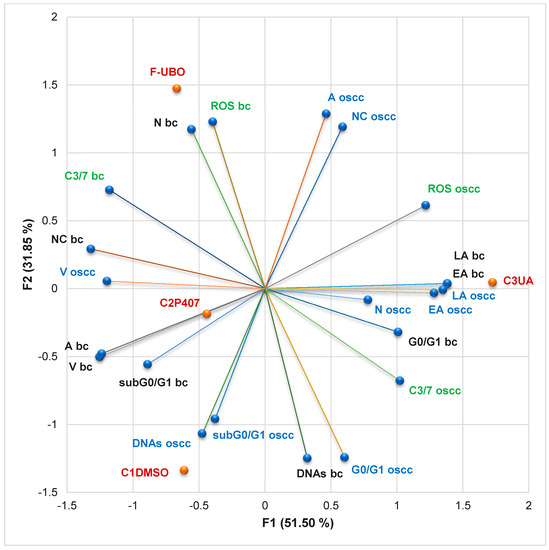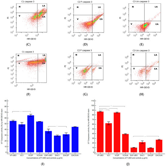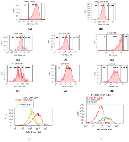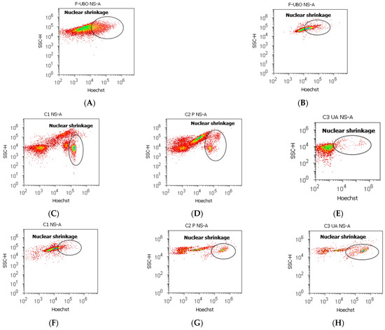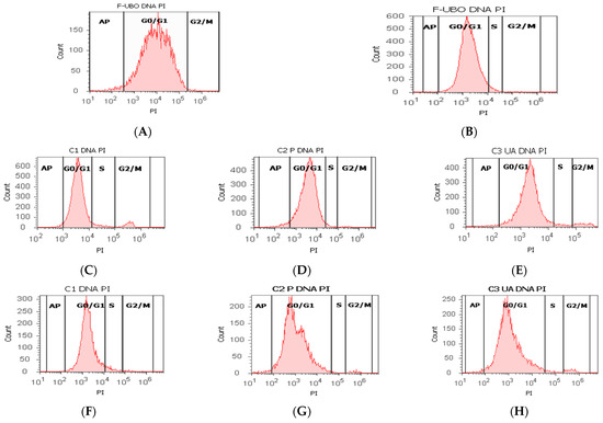 The present study platform for in vitro F-UBO cytotoxicity analysis was the Attune Acoustic focusing cytometer (Applied Biosystems, Bedford, MA, USA). Before cell analysis, the flow cytometer was first set by fluorescent beads—Attune performance tracking beads, labeling, and detection (Life Technologies, Europe BV, Bleiswijk, The Netherlands), with standard size (four intensity levels of beads population). The cell amount was established by counting cells below 1 µm [52]. Using forward scatter (FSC) and side scatter (SSC), more than 10,000 cells per sample for each analysis were gated.