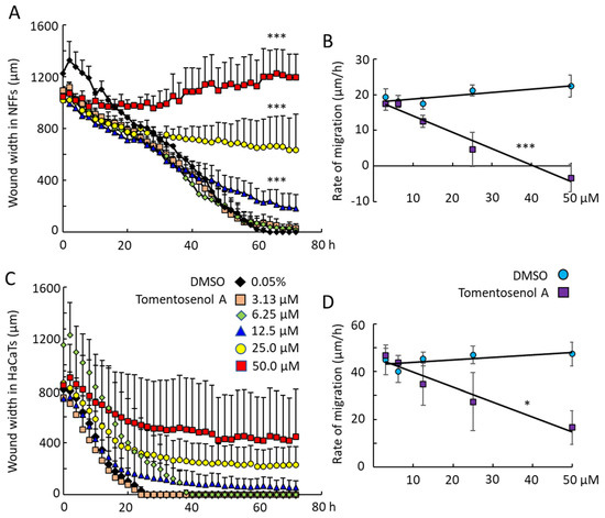 Scratch wound assays were used to examine the effect of Compound 1 on NFF and HaCaT cell migration into a wound region. Compound 1 caused a concentration-dependent inhibition of wound repopulation by NFF (Figure 5A,B) and HaCaT cells (Figure 5C,D). Wound closure was achieved within 60 h for NFFs and within 26 h for HaCaTs exposed to the diluent (DMSO) control. The rates of wound closure were measured by examining the slope of the plot of wound width versus time and plotting this against the concentration of Compound 1. The horizontal line for the DMSO control indicated that the vehicle had neither a stimulatory nor inhibitory effect on cell migration into the wound. In contrast, the line decreased with increasing concentrations of Compound 1, indicating that the compound caused a concentration-dependent inhibition of cell migration. This inhibitory effect was significant for Compound 1 in NFFs (p < 0.001; Figure 5B) and HaCaTs (p < 0.05; Figure 5D). By limiting the migration of cells into the wound region, tomentosenol A (1) may suppress the fibrotic response.