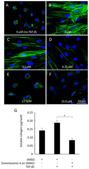 During the wound healing process, fibroblasts are activated by TGF-β1 to differentiate into type I collagen-producing myofibroblasts [2,23], which are readily distinguished from non-differentiated cells by the expression of the cytoskeletal microfilament, α-smooth muscle actin (α-SMA). Agents that interfere with the TGF-β1 signalling pathway may provide anti-fibrotic benefit by inhibiting myofibroblast differentiation and collagen production [3]. This has been reported previously for small molecule meroterpenoids, petchiether A [24] and ganodercin M [25], isolated from the fruiting body of fungi, Ganoderma petchii and G. cochlear. The effect of Compound 1 on NFF-myofibroblast differentiation was examined by stimulating cells with TGF-β1 (10 ng/mL) and immunostaining for α-SMA. Fibroblasts remained non-differentiated when incubated without TGF-β1, as evidenced by the absence of α-SMA stress fibres (Figure 6A). In contrast, α-SMA fibres were detected in fibroblasts incubated with TGF-β1 (Figure 6B), consistent with myofibroblast differentiation. The α-SMA stress fibres remained visible in cells that were co-incubated with the lowest concentration of Compound 1 (3.1 µM) and TGF-β1 (Figure 6C). While staining for α-SMA was markedly diminished (6.25 µM; Figure 6D) or abolished (12.5–25 µM; Figure 6E,F) with higher concentrations of Compound 1, cells remained viable throughout, thereby discounting any significant cytotoxic effects. In addition, TGF-β1-stimulated secretion of soluble collagen was supressed by co-incubation with Compound 1 (12.5 µM; p < 0.05, Figure 6G).