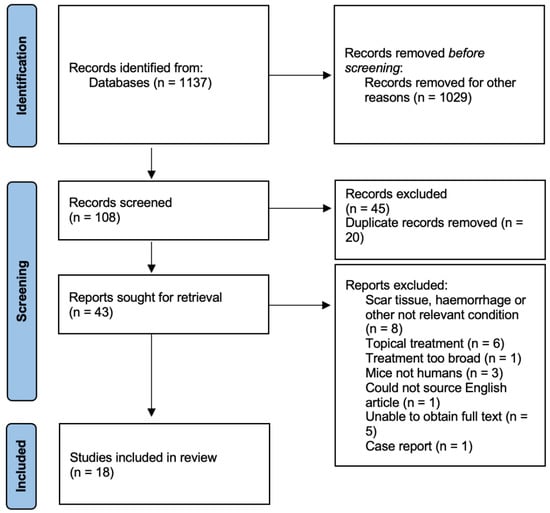 We initially identified 1137 studies from our database searches. Of these, 108 were screened based on their title and abstracts. Forty-five were then excluded and 20 were duplicates. Forty-three articles were selected for full-text reading, and, of these, 18 were relevant for inclusion. The criteria for exclusion are listed in Figure 1.