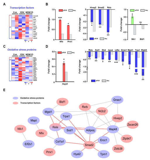 Interaction between oxidative stress proteins and transcription factors at the proteomic level. (A) Heatmap shows the upregulated and downregulated transcription factors in nerves between 1DIV and NEM/1D. (B) qPCR validation of the transcription factors obtained from (A) using ex vivo mouse sciatic nerves. Red bars, blue bars, and green bars represent upregulated, downregulated, and mixed genes compared with proteomics data. RNA-sequencing, Seq. (C) Heatmap was constructed for the significantly different oxidative stress proteins in nerves between 1DIV and NEM/1D. (D) Validation of significantly differentially expressed oxidative stress proteins using qPCR. One upregulated and eight downregulated oxidative stress proteins were validated. RNA-sequencing, Seq. (E) Interaction network between oxidative stress proteins and transcription factors. Among the connecting lines, the red lines indicate the interaction between oxidative stress proteins and transcription factors. Gray nodes represent proteins interacting with oxidative stress proteins. Comparisons were performed using a Student’s t-test. * p < 0.05, ** p < 0.01, and *** p < 0.001.