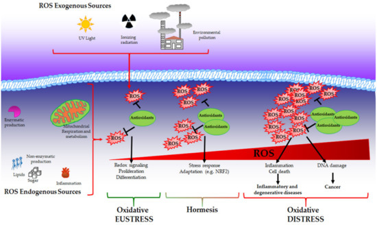 Oxidative eustress, hormesis and oxidative distress. Reactive oxygen species (ROS) can be produced by both exogenous and endogenous sources and are balanced by the presence of antioxidants that collaborate to maintain redox homeostasis. Under this condition called oxidative eustress, ROS act as pleiotropic signalling molecules playing a role in cell growth, proliferation and differentiation. When ROS production reaches moderate levels, a cell adaptive response is promoted to guarantee cell survival (hormesis). Supraphysiological ROS levels induce irreversible damage to biological macromolecules (oxidative distress), contributing to the onset of inflammatory, degenerative and neoplastic diseases.