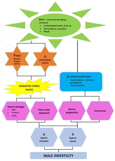 The term “endocrine-disrupting chemical” (EDC) has been defined as “an exogenous substance or a mixture that alters function(s) of the endocrine system and consequently causes adverse health effects in an intact organism, or its progeny, or (sub)populations” [1]. Several studies have found that the endocrine system of exposed individuals may be disrupted by EDCs, and exposure can also have an impact on human reproduction and development [2,3,4,5]. EDCs can interfere with the normal functions of endogenous hormones by changing hormone levels, blocking or boosting hormone production, or modifying hormone transport across the body, thereby disrupting hormonal control [4]. Exposure to EDCs in humans can occur via absorption through the skin, inhalation in the air, or ingestion of contaminated food and water. However, human exposure to EDCs occurs most frequently when contaminated food is consumed. Bisphenol A (BPA), phthalates, parabens, nonylphenols, and heavy metals are the EDCs most frequently found in contaminated food. In male reproductive health, EDCs have been associated with alternations in fetal development, such as hypospadias and cryptorchidism, as well as lower semen quality, resulting in male infertility. In addition, development of testicular germ-cell, prostate, and breast cancers has been observed in relation to EDCs [4,5,6].