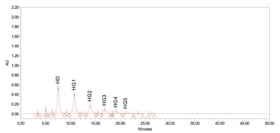 The enzymatic synthesis of hesperidin glucosides was performed using dextrin as a glucose donor and hesperidin as an acceptor. As shown in Figure 2, various hesperidin glucosides were obtained through transglycosylation by CGTase. The glucose units bound to hesperidin were up to 5–6 glucose units after the reaction. The rate of enzymatic conversion from hesperidin to hesperidin glucoside in this study was 76.04 ± 4.97%. The obtained hesperidin poly-glucosides were then treated with a glucoamylase to remove the glucose units from hesperidin poly-glucosides, leaving hesperidin mono-glucoside. Hesperidin mono-glucoside obtained through a series of enzyme reactions was separated from residual sugars and unreacted hesperidin by centrifugation/filtration and purified using a column filled with adsorption resin. High purity hesperidin glucoside of 95% or more was obtained through column chromatographic separation and crystallization.