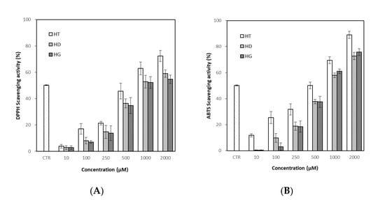 Antioxidant activity of hesperetin, hesperidin and hesperidin glucoside. Results were expressed as a mean ± SD (n = 3). (A) 1,1-diphenyl-2-picrylhydrazyl (DPPH) radical scavenging activity, (B) 2,2′-azino-bis-3-ethylbenzthiazoline-6-sulphonic acid (ABTS) radical scavenging activity. CTR+; positive control (ascorbic acid), HT; hesperetin, HD; hesperidin, HG; hesperidin glucoside.