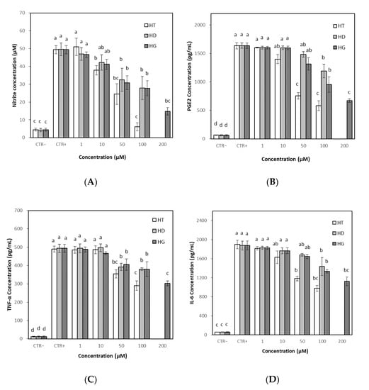 Effect of hesperetin, hesperidin and hesperidin glucoside on the production of nitric oxide (NO), Prostaglandin E2 (PGE2), tumor necrosis factor alpha (TNF-α) and interleukin 6 (IL-6). RAW 264.7 cells were cultured with different concentrations of hesperetin, hesperidin and hesperidin glucoside for 24 h with LPS (1 μg/mL). Results were represented as mean ± SD (n = 3). (A) Effect on NO levels; (B) Effect on PGE2 levels; (C) Effect on TNF-α levels; (D) Effect on IL-6 levels. Different letters (a, b, c, d) above the bars indicate significant differences (p < 0.05), where letters ab or bc indicate the intermediate significance between a and b, or b and c, respectively. CTR−; Negative control, CTR+; Positive control (with LPS), HT; hesperetin, HD; hesperidin, HG; hesperidin glucoside.
