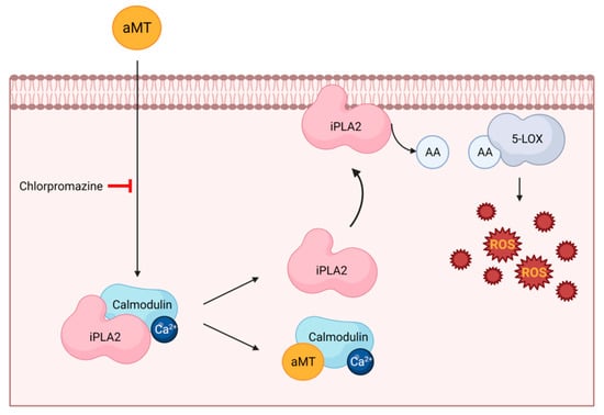 Melatonin induces ROS production in cancer cells through calmodulin binding. Melatonin binds to calmodulin, leading to the release of sequestered Ca2+-independent PLA2, which is then free to move to membranes and to release high doses of AA; in turn, liberated AA feeds 5-LOX to produce free radicals. Melatonin (aMT); Ca2+-independent PLA2 (iPLA2); arachidonic acid (AA); 5-lipoxygenase (5-LOX). Image created using BioRender.com(accessed on 16 July 2022).