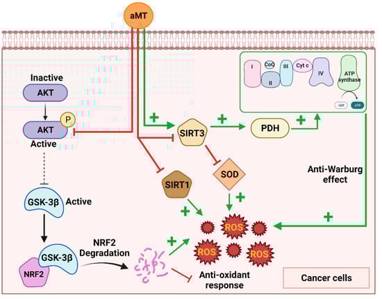 Different mechanisms by which melatonin induces ROS production in cancer cells. Melatonin inhibits the AKT pathway, leading to the activation of GSK-3β, which induces NRF2 degradation. On the other hand, melatonin regulates Sirtuin 3 (SIRT3) through its activation or inhibition, leading to an anti-Warburg effect or SOD inhibition, respectively. Finally, melatonin has been shown to inhibit SIRT1 in cancer cells. All these processes lead to an increase in ROS production and antitumor activity. Melatonin (aMT); glycogen synthase kinase-3β (GSK-3β); superoxide dismutase (SOD); pyruvate dehydrogenase (PDH). Image created using BioRender.com (accessed on 18 July 2022).