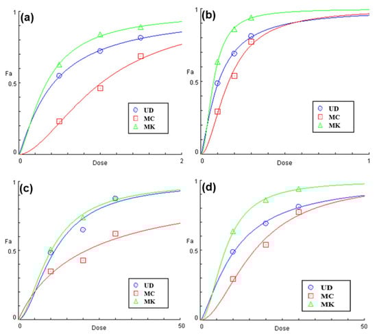 Dose-response profiles of the estimated EC50 (mg/mL) of (a,c) aqueous and (b,d) ethanolic extracts of U. dioica (UD), M. chamomilla (MC), and M. koenigii (MK) on the (a,b) DPPH and (c,d) ABTS assays.