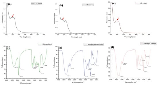 UV-Vis spectral analysis was recorded in the range of 200–800 nm with intervals of 1 nm and showed maximum absorption at 277 and 321 nm for UD, 266 and 323 nm for MC, and 286 and 316 nm for MK. Beer’s rule asserts that the amount of light absorbed at a specific frequency is proportional to the sample’s composition absorption coefficient [55]. As a result, all spectral fluctuations caused by spectrophotometer and sample inaccuracies must be rectified before information processing. Peaks in crude extracts indicated the presence of a variety of ingredients or chemicals, particularly unsaturated bonds in conjugated or aromatic components [56].