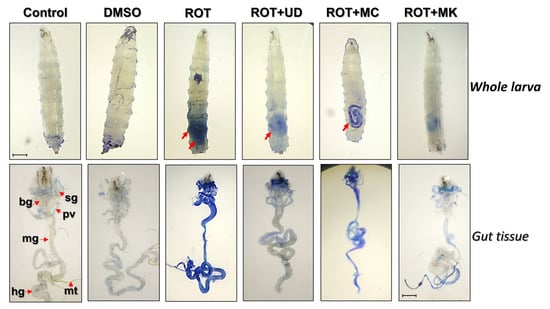 The cytotoxicity of rotenone and amelioration of cytotoxicity through the use of bioactive compounds (UD, MC, and MK) were determined through a dye exclusion test (trypan blue) in whole larvae and tissues of ROT-exposed organisms. Of the larvae exposed to ROT, 95% showed blue staining in the whole larvae and their tissues (brain ganglia, salivary gland, midgut, and gastric caeca). ROT combined with MK exhibited significantly less blue staining than the ROT + UD and ROT + MC groups in the whole larvae and the abovementioned tissues, respectively. This observation is supported by a previous study on ROT, which found that nutraceuticals significantly improved cell viability [64]. This protective property of UD, MC, and MK may be attributed to the presence of bioactive components responsible for quenching free radicals or due to the upregulation of antioxidative defense mechanisms.