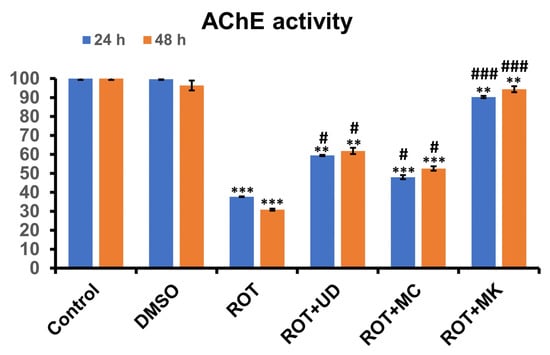 Acetylcholinesterase (AChE) is a vital enzyme of the cholinergic system that modulates physiological processes, including memory and locomotor activities. It hydrolyzes acetylcholine to choline and acetate, thereby terminating cholinergic neurotransmission between synapses. In this study, it was found that when the larvae were exposed to ROT for 24 h, they exhibited a statistically significant (p < 0.001) inhibition of AChE activity compared with the control or DMSO and had ~60% reduced AChE levels. When ROT was coexposed with MK, AChE levels were improved, and only 9.7% inhibition was evident. AChE levels were improved to a lesser extent in the ROT + UD and ROT + MC groups compared with the control. These elevated levels of AChE were significant when compared with the ROT-treated groups. The maximum inhibition of AChE levels was present in ROT-exposed organisms after 48 h compared with control larvae, and the highest rescue from ROT-induced toxicity was observed in the ROT + MK group, followed by the ROT + UD and ROT + MC groups. We observed that inhibition of AChE in ROT-exposed organisms and nutraceuticals helps to rescue AChE levels, which is supported by previous observations [66,67].