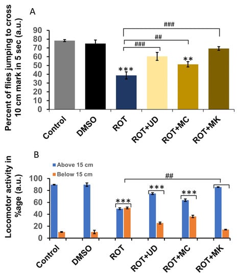 To determine whether the treatment has any impact on the survival of the flies during the experimental period, preliminary studies were conducted with small numbers of flies, testing several concentrations (0.01, 0.025, 0.05, and 0.1%) of UD, MC, and MK. However, only one concentration, i.e., 0.1% per unit of the medium, was selected as the optimum concentration from the conclusive studies. Nevertheless, to evaluate the cellular and neurological protective properties of UD, MC, and MK, the concentration of rotenone (500 µM) used was selected based on our findings in Drosophila and those of other published studies [42,43,44].