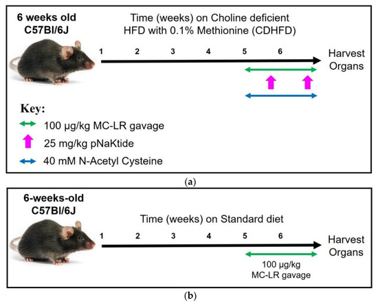 Overview of the study designs to study the effect of antioxidants on low dose exposure to MC-LR with (a) choline deficient high fat diet–induced NAFLD and (b) healthy C57Bl/6J mice. (a) Six-week-old mice were fed on CDHFD for six weeks to induce NAFLD. During weeks 5 and 6, mice were orally gavaged with 100 µg/kg MC-LR every 24 h. Mice in the antioxidant groups were given an I.P. injection of 25 mg/kg pNaKtide once a week (2 doses) or 40 mM NAC in drinking water every day during weeks 5 and 6. (b) In a parallel study the mice were fed a standard diet and gavaged with MC-LR during weeks 5 and 6.