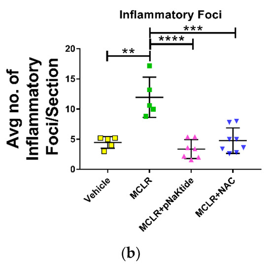 Histopathological analysis was performed on liver sections using H&E staining. As seen in Figure 3, significant immune cell infiltration and aggregation was observed in the livers of CDHFD mice that were exposed to MC-LR as compared to their vehicle treated counterparts (Figure 3a). In the same model, mice treated with antioxidants pNaKtide, and NAC showed significant decrease in infiltrating immune cells (Figure 3a). The inflammatory foci (circled in green) were quantified in five fields selected randomly for each liver section. Quantification showed the significant increases in inflammation in MC-LR exposed livers as compared to non-exposed Vehicle livers. These were significantly reduced on treatment with antioxidants (Figure 3b). No inflammation was observed in the livers of either Vehicle of MC-LR exposed Diet Control mice (data not shown).