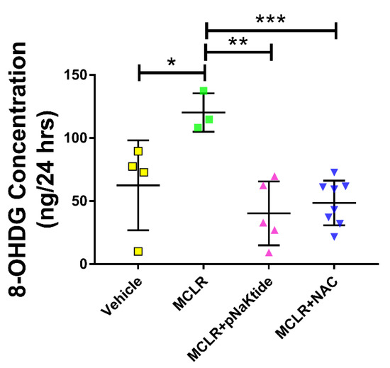 Oxidative stress is significantly reduced after antioxidant treatment. 8-OHDG levels in urine were elevated on exposure to MC-LR and reduced after treatment with antioxidants. * p ≤ 0.05, ** p ≤ 0.01, *** p ≤ 0.001.