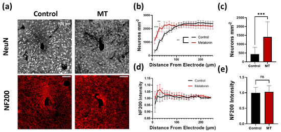 Melatonin (MT) administration preserves neuron density near the electrode site. (a) Representative images for NeuN (neurons) and NF200 (axons) staining in control and MT groups. (b) Plot of neuron body density (counted neurons per square μm) versus distance from implanted electrode center. (c) Bar graph depicting neuron density at 20 μm from electrode site. (d) NF200 intensity normalized to image corners versus distance from electrode. (e) Bar graph depicting normalized NF200 intensity at 20 μm from electrode site. (**: p < 0.01, ***: p < 0.001, two-way ANOVA).