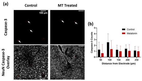 Melatonin (MT) decreases Caspase-3 expression in acute electrode implantation. (a) Representative images for Caspase-3 (apoptosis marker) staining in control and MT groups. White arrows indicate areas with Caspase-3 expression. Overlay with NeuN (grey) and Caspase-3 (red) to indicate neuron death. (b) Caspase-3 counts for both groups at different distances from electrode center (n.s., Two-way ANOVA).