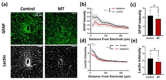 Melatonin (MT) administration prevents astrocytic activation near the electrode site. (a) Representative images for GFAP (astrocytes) and tomato lectin (vasculature and microglia) staining in control and MT groups. (b) Plot of GFAP intensity normalized to image corners versus distance from electrode center. (c) Bar graph depicting normalized GFAP intensity at 50 μm from electrode site. (d) Tomato lectin intensity normalized to image corners versus distance from electrode. (e) Bar graph depicting normalized tomato lectin intensity at 50 μm from electrode site. (*: p < 0.05, **: p < 0.01, ****: p < 0.0001, Two way ANOVA).