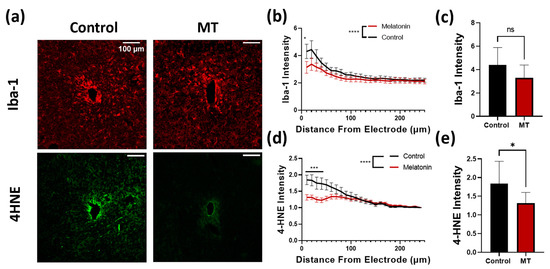 Melatonin (MT) administration prevents microglial activation and lipid peroxidation near the electrode site. (a) Representative images for Iba-1 (microglia) and 4HNE (lipid peroxidation) staining in control and MT groups. (b) Plot of Iba-1 intensity normalized to image corners versus distance from electrode center. (c) Bar graph depicting normalized Iba-1 intensity at 50 μm from electrode site. (d) 4HNE intensity normalized to image corners versus distance from electrode. (e) Bar graph depicting normalized 4HNE intensity at 50 μm from electrode site. (*: p < 0.05, ***: p < 0.001, ****: p < 0.0001, two-way ANOVA).