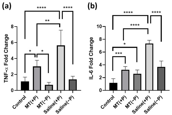 PCR relative quantification of TNF-α and IL-6-fold change indicative of inflammatory response under various conditions. Fold change is relative to assay standards. (a) Comparison of TNF-α fold change near electrode implant between groups. (b) Comparison of IL-6-fold change near electrode implant between groups. (*: p < 0.05, **: p < 0.01, ***: p < 0.001, ****: p < 0.0001. One way ANOVA). Groups: Control (untouched neural tissue), MT(+P) (MT-treated neural tissue with probe implanted), MT(−P) (MT-treated neural tissue without probe implanted), Saline(+P) (saline-treated neural tissue with probe implanted), and Saline(−P) (saline-treated neural tissue without probe implanted).