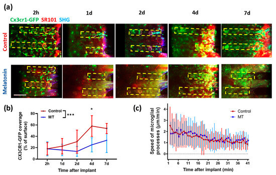 To investigate how and when melatonin begins affecting inflammatory responses toward neural probes, microglial activities were monitored after neural probe implantation in vivo using TPM in CX3CR1-GFP mice (Figure 6a). Microglia, the resident immune cells in the brain, have been reported as the first responder to neural electrode implantation and could trigger a series of inflammatory responses. Prior TPM works have revealed that microglial morphology is dynamically changing in the brain: in homeostatic conditions, microglia constantly survey the surrounding environment with moving processes [43]; upon neural electrode implantation, microglia first send processes toward the implant and then tend to encapsulate the device [40]. To illustrate whether MT influences microglial process extension and encapsulation, we tracked the speed of microglia processes moving toward the implant immediately after insertion of the neural probe (Figure 6c), as well as microglia coverage of the probe surface at 2 h, 1 day, 2 days, 4 days, and 7 days after probe implant (Figure 6b).
