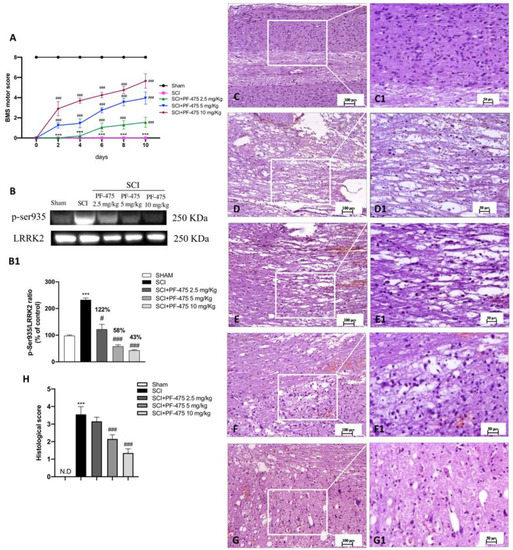 Effects of PF-475 treatments on motor disturbance, phosphorylated LRRK2 at Serine 935 expression, and histological features after SCI. BMS open-field score was performed for 10 days after SCI (A). Motor function was not altered in sham mice (black line) compared with SCI- injured mice (pink line), while PF-475 (5 and 10 mg/kg) significantly restored motor functions (blue and purple lines). Representative Western blot of phosphorylated LRRK2 at Serine 935 protein expression level in cytosolic fraction of spinal cord tissues after SCI and PF-475 treatments (B,B1). The samples used derive from the same experiment and those gel/blots were processed in parallel. Hematoxylin and eosin (H,E) staining of Sham group (C,C1) and SCI group ((D,D1), see histological score (H)). PF-475 treatments after SCI: PF-475 2.5 mg/kg ((E,E1) see histological score (H)); PF-475 5 mg/kg ((F,F1); see histological score (H)) and PF-475 10 mg/kg ((G,G1); see histological score (H)). Each data is expressed as SD from ten mice for each group. One-way ANOVA followed by Bonferroni post-test and two-way ANOVA followed by post hoc test for multiple comparisons. (ND) Not detectable. *** p < 0.001 vs. sham, # p < 0.05 vs. SCI; ### p < 0.001 vs. SCI.