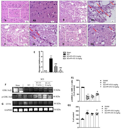 Effects of PF-475 on glycogen metabolism alterations after SCI. Sham group (A,A1). SCI group (B,B1). PF-475 treatments after SCI 2.5 and 5 mg/kg ((C,C1,D,D1), respectively). Glycogen relative amount (E). *** p < 0.001 vs. Sham; ### p < 0.001 vs. SCI. Cytosolic fractions of spinal cord tissues were used to evaluate glycogen metabolism. Representative Western blots of GSK-3α/β and GYS1 protein expression levels after SCI and PF-475 treatments ((F,G) and densitometric analysis (F1,G1), respectively). Each data is expressed as SD from ten mice for each group. One-way ANOVA followed by Bonferroni post-test. (ND) Not detectable. *** p < 0.001 vs Sham; # p < 0.05 vs SCI. The samples used derive from the same experiment and those gel/blots were processed in parallel.