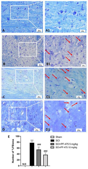 Effects of PF-475 on the myelination process evaluated in spinal cord sections. LFB staining showed healthy neurons (blue) in Sham group (A,A1) and an accumulation of myelin (purple) in the SCI group (B,B1). PF-475 treatments (2.5 and 5 mg/kg) after SCI groups reduced the myelin accumulation ((C,C1,D,D1) respectively). Number of LFB+ cells over the total LFB area (E). Each data is expressed as SD from ten mice for each group. One-way ANOVA followed by Bonferroni post-test. (ND) Not detectable. *** p < 0.001 vs. Sham; ### p < 0.001 vs. SCI.
