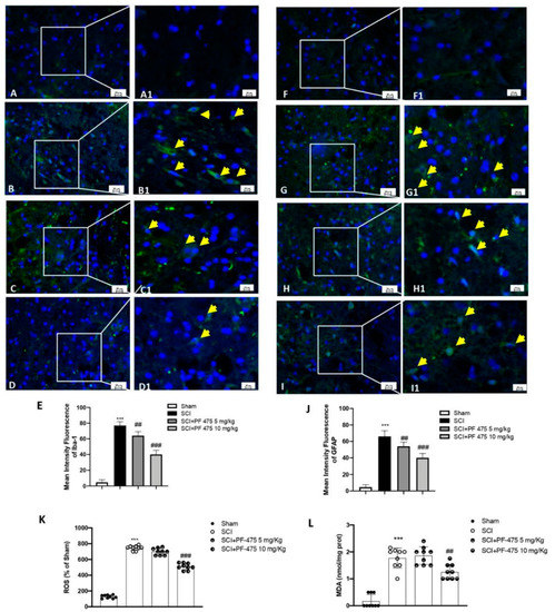 Immunofluorescence analysis of Iba1 and GFAP after SCI. Spinal cord sections were stained with antibodies against Iba1 (green) or GFAP (green) and DAPI to highlight cell nuclei (blue). Sham group ((A,A1); see mean of intensity fluorescence (E)). Iba1 + cells in mice subjected to SCI ((B,B1); see mean of intensity fluorescence (E)). Mice treated with PF-475 at doses of 5 mg/kg ((C,C1); see mean of intensity fluorescence (E)) and 10 mg/kg ((D,D1); see mean of intensity fluorescence (E)). No GFAP + cells showed in. Sham group ((F,F1); see mean of intensity fluorescence (J)). High number of GFAP + cells in SCI group ((G,G1); see mean of intensity fluorescence (J)). PF-475 treatment at a dose of 5 mg/kg ((H,H1); see mean of intensity fluorescence (J)) decrease GFAP+ cells number. PF-475 treatment at a dose of 5 mg/kg ((I,I1); see mean of intensity fluorescence (J)). The content of ROS in spinal cord tissues. (K) The concentrations of MDA in spinal cord tissues (L). Each data is expressed as SD from ten mice for each group. One-way ANOVA followed by Bonferroni post-test. *** p < 0.001 vs. sham and ## p < 0.01 and ### p < 0.001 vs. SCI.