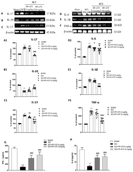Effects of PF-475 on cytokine expression after SCI. Cytosolic fractions of spinal cord tissues were used to evaluate inflammatory cytokines expression such as IL-17, IL-13, IL-6, IL-1β, and TNF-α, representative blots are shown. Representative blots of inflammatory cytokines such as IL-17, IL-13, IL-6, IL-1β, and TNF-α are shown ((A,C–F), see densitometric analysis (A1,C1–F1). Expression level of the anti-inflammatory cytokine IL-10 (B); see densitometric analysis (B1). Data represent the means of at least three independent one-way ANOVA experiments followed by post hoc Bonferroni *** p < 0.001 vs. Sham; # p < 0.05; ## p < 0.01 and ### p < 0.001 vs. SCI. ELISA method was performed for detection of TNF-α and IL-4 in total protein extract of spinal cord tissues ((G,H) respectively). Each data is expressed as SD from ten mice for each group. One-way ANOVA followed by Bonferroni post-test. *** p < 0.001 vs Sham; ### p < 0.001 vs. SCI. The samples used derive from the same experiment and those gels/blots were processed in parallel.