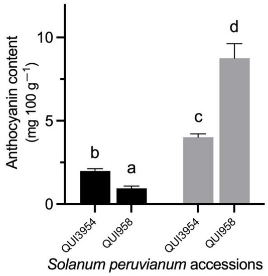 Anthocyanin content in the fruit peel of Solanum peruvianum QUI3954 and QUI958 accessions under drought stress. Samples from optimal- and restricted-watering plants are shown in black and grey bars, respectively. Content is expressed as mg of delphinidin 3-glucoside equivalent per 100 g of fruit peel. Error bars in each column indicate the standard deviation of three replicates. A Duncan’s multiple comparisons test was performed with 95% confidence. Different letters indicate significant differences between means. For details see the Section 2.