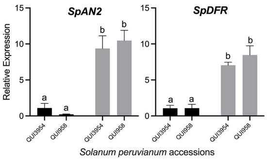 Relative expression levels of SpAN2 and SpDFR genes in the fruit peel of Solanum peruvianum QUI3954 and QUI958 accessions under drought stress. Samples from well irrigated- and restricted watered plants are shown in black and grey bars, respectively. Error bars in each column represent the standard deviation of three replicates. For SpAN2, Duncan’s multiple comparisons test was performed with 95% confidence. In SpDFR, a non-parametric analysis of variance was performed using the Kruskal–Wallis test. Different letters indicate significant differences between means. For details see the Section 2.
