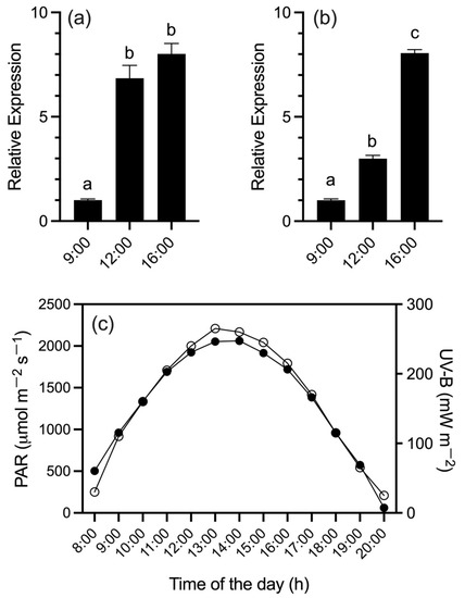 Relative expression levels of (a) SpAN2 and (b) SpDFR genes in the fruit peel of Solanum peruvianum accession QUI958 under sunlight radiation. The expression of each gene was measured at 9:00, 12:00, and 16:00 h. Error bars in each column represent the standard deviation of three replicates. For both genes, Tukey’s multiple comparisons test was performed with 95% confidence. Different letters indicate significant differences between means. (c) The radiation index for UV-B (µW m−2) (white circles) and PAR (µmol m−2 s−1) (black circles) for the fruit sampling day (15 January 2020) is shown. For details see the Section 2.