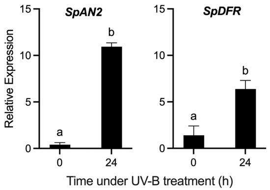 Relative expression levels of SpAN2 and SpDFR genes in the fruit peel of Solanum peruvianum accession QUI958 under UV-B radiation treatment. The expression of each gene was measured at 0 and 24 h of UV-B radiation treatment. Error bars in each column represent the standard deviation of three replicates. The unpaired Student’s t-test was used to compare the means. Different letters indicate significant differences between means. For details see the Section 2.
