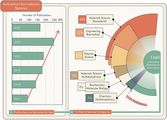 According to the Web of Science database [21], there are 1460 registered publications searched through the “antioxidant biomaterials” keyword, of which 168 are literature re-views. These publications are divided by field, highlighting Materials Science Biomaterials, Engineering Biomedical, Polymer Science, Materials Science Multi-disciplinary, and Biochemistry Molecular Biology (Figure 2B). Furthermore, there is a prospect of growth in the number of publications per year, as shown in Figure 2A. Thus, antioxidant biomaterial technology is a promising alternative for improving materials science technology.