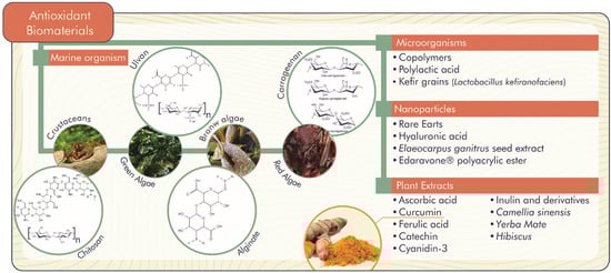 Biomaterials are derived from synthetic or natural renewable sources. They must present characteristics such as immunogenicity, availability, low production cost, and resistance to sterilization processes to be considered biodegradable, economical, and promising alternatives for applications in different industrial areas [7]. The conscious production of biomaterials presents a viable and sustainable alternative for replacing packaging [8] and textile materials [9], as well as applications in the areas of biomedicine and dentistry [10,11]. Some biomaterials show biological properties derived from raw material sources. These biomaterials have attracted investigators because of their antioxidant properties. Therefore, this review is focused on antioxidant biomaterials from natural sources for health and food applications.