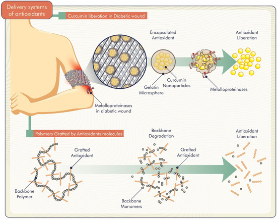 Studies demonstrate different delivery systems of antioxidants incorporated in biomaterials. Gelatin microspheres loaded with curcumin nanoparticles were developed by Liu et al. [58]. Curcumin release was greater in the presence of matrix metalloproteinases, which are generally overexpressed in non-healing diabetic wound sites (Figure 4). Thus, the system was responsive to these metalloproteinases, and curcumin was released specifically at the sites to enhance bioactive effects. Another curcumin-related study by Roy and Rhim [39] evaluated the release of curcumin from poly (lactic acid)-based functional films. The authors reported a slow curcumin release from the films that started after a few hours of immersion in water. Furthermore, the release was low, probably due to the low water solubility of curcumin.