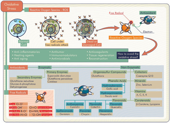 If a biomaterial is implanted, it typically triggers some degree of inflammatory response and accompanying healing. If it turns into an excessive inflammation, reactive oxygen species (ROS) are ordinarily produced to regulate the healing response. Therefore, the biomaterial’s function may be negatively affected both short and long term [4]. ROS are products of oxygen metabolism identified as molecules with unstable bonds or species with one or more unpaired electrons on the external orbital. Besides the endogenous origin, the generation of these species can also occur via exogenous causes and provides instability, causing exceptional reactive behaviors. When ROS production increases, the balance between their amount and the antioxidant defense is altered, and oxidative stress occurs [5]. This imbalance has implications for many disease states, including cardiovascular damage, inflammation, cancers, and neurodegenerative diseases [6].