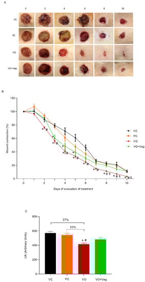 Figure 4A shows typical photographs of the dryness of wounds in each group. As can be seen, at 0 and 4 days, all treatments (PC, VO, or VO + Veg) were able to reduce early bleeding compared to the VC group (Figure 4B). Interestingly, the VO groups showed, from day 0, better bleeding control compared to the other groups.