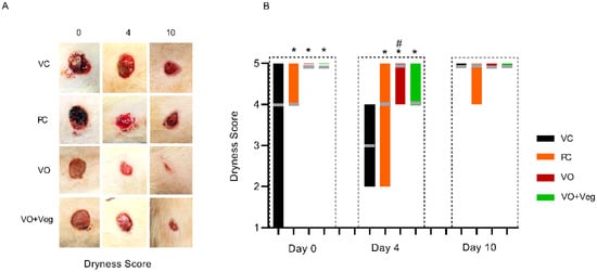 Typical images of dryness in respective groups and treatment evaluation time (A). Graph of dryness scores in VC, PC, VO, and VO + Veg groups, in three periods of evaluation. The bars represent the data dispersion (minimum and maximum), and the horizontal gray lines represent mode (B). * p < 0.05: VO vs. VC; # p < 0.05: VO vs. PC.